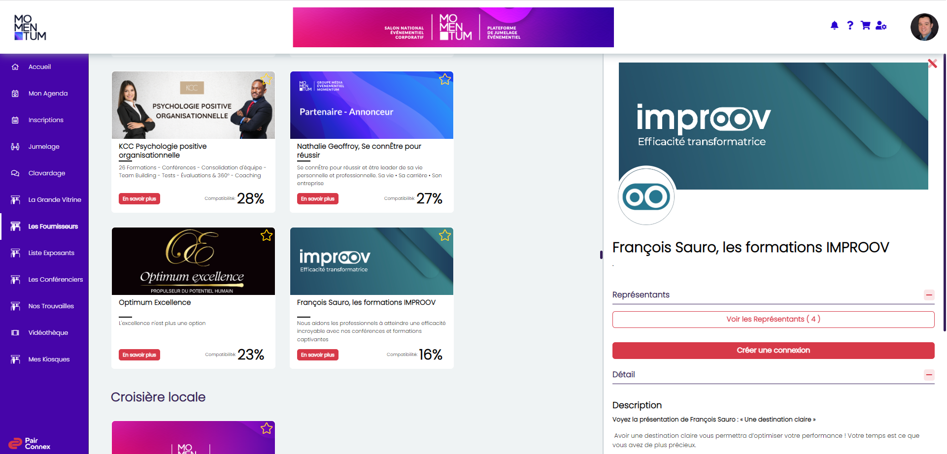 À cet effet, vous connaissez peut-être le Salon Événementiel Momentum qui, deux fois par année depuis plus de 20 ans, regroupe des centaines de fournisseurs et planificateurs du domaine événementiel. Mais connaissiez-vous le penchant numérique du Salon? La plateforme Momentum Plus est le répertoire intelligent par excellence. Elle regroupe plus de 500 fournisseurs de tous les domaines, que vous soyez à la recherche d’une salle ou d’un conférencier, la plateforme du salon événementiel Momentum vous aidera grandement dans votre recherche en vous proposant des fournisseurs selon vos besoins et critères de recherche.