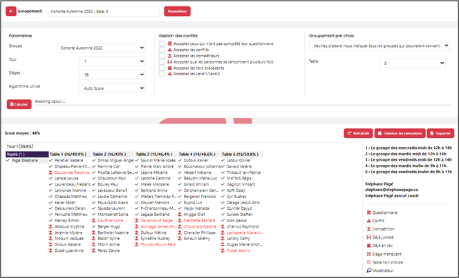 Une fois tous ces paramètres configurés, il suffira de lancer l’algorithme sur la plateforme PairConnex et les participants seront automatiquement affectés à un groupe. Les groupes seront optimisés en fonction de la compatibilité des participants, tout en respectant les règles et contraintes fixées.