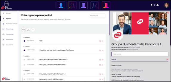 Les différentes cohortes des Clans peuvent se dérouler en présentiel ou bien en virtuel. Le tableau de bord permettra donc de retrouver facilement l’horaire et le lieu de leurs quatre rencontres, avec des rappels automatiques programmés la veille ou le matin des activités. Lorsque les rencontres sont virtuelles, la plateforme sert aussi à accéder aux liens de vidéoconférence où se tiennent les rencontres.